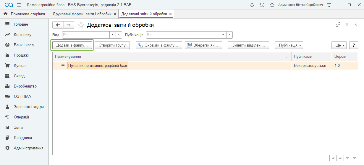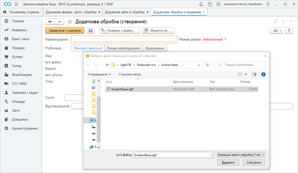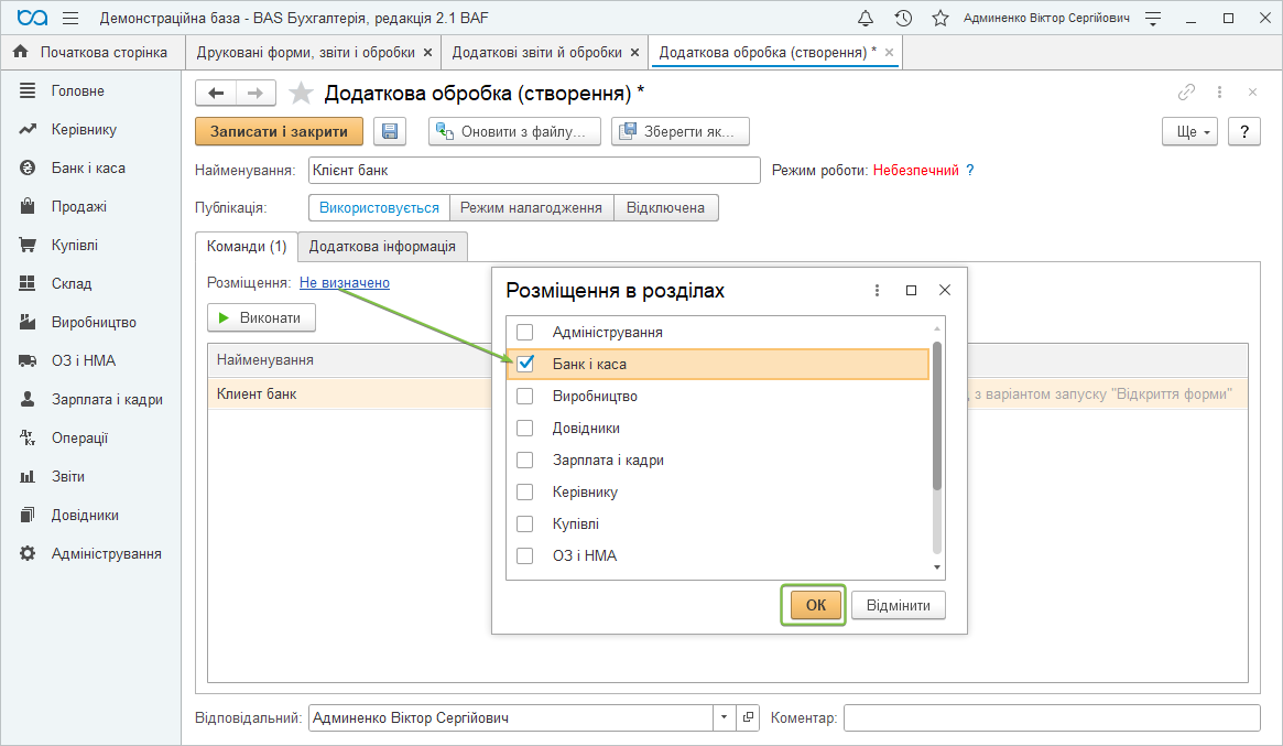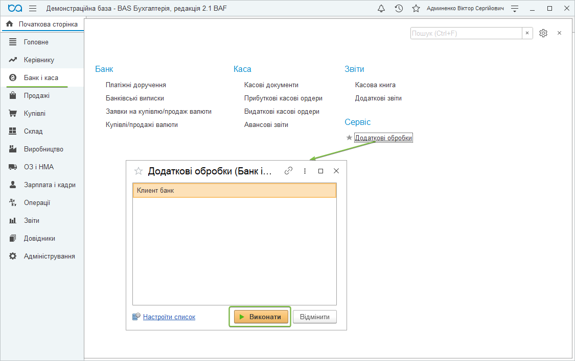 Таким образом, модуль установлен и согласно настройкам выше пользователь Админенко сможет открыть модуль в разделе Банк и касса – Сервис – Дополнительные обработки.