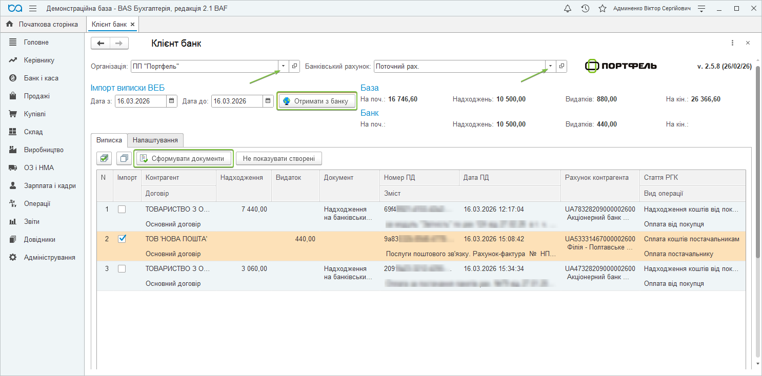 Чтобы загрузить выписку через API ПриватБанк или Монобанк, выберите Организацию, Банковский счет, укажите Дата с и Дата до и нажмите кнопку Получить из банка. Просмотрите загруженную выписку и нажмите кнопку Сформировать документы.