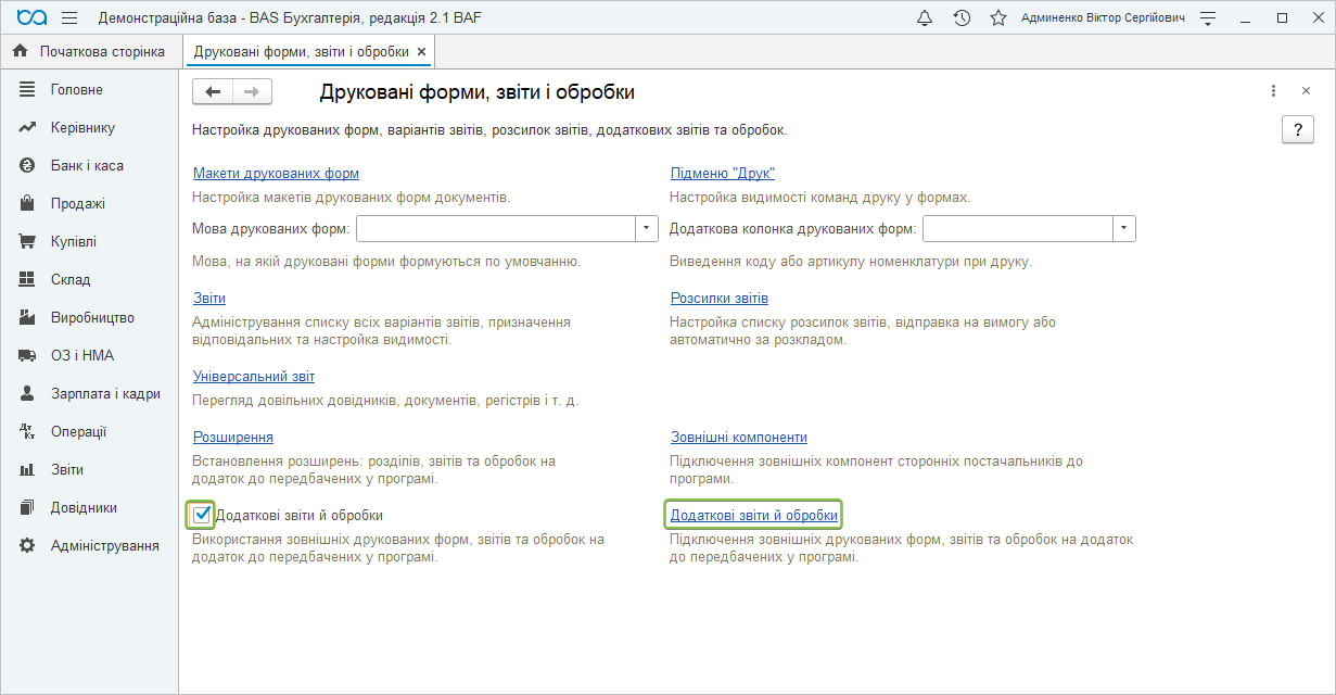 1. Перейдите в раздел «Администрирование» – «Печатные формы, отчеты и обработки». Установите отметку Дополнительные отчеты и обработки и нажмите соответствующую ссылку.