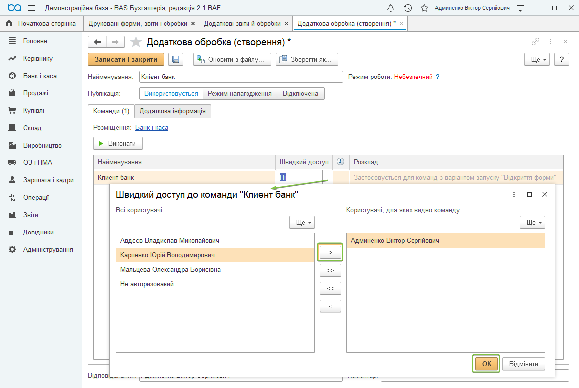 перенесите пользователей, которые смогут открывать обработку, с левой в правую таблицу окна и нажмите OK.