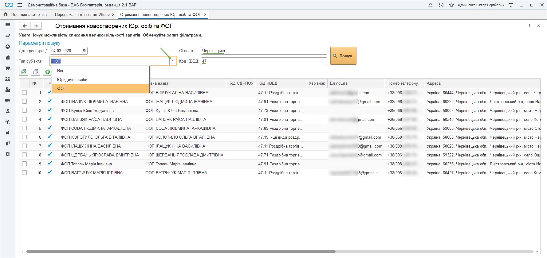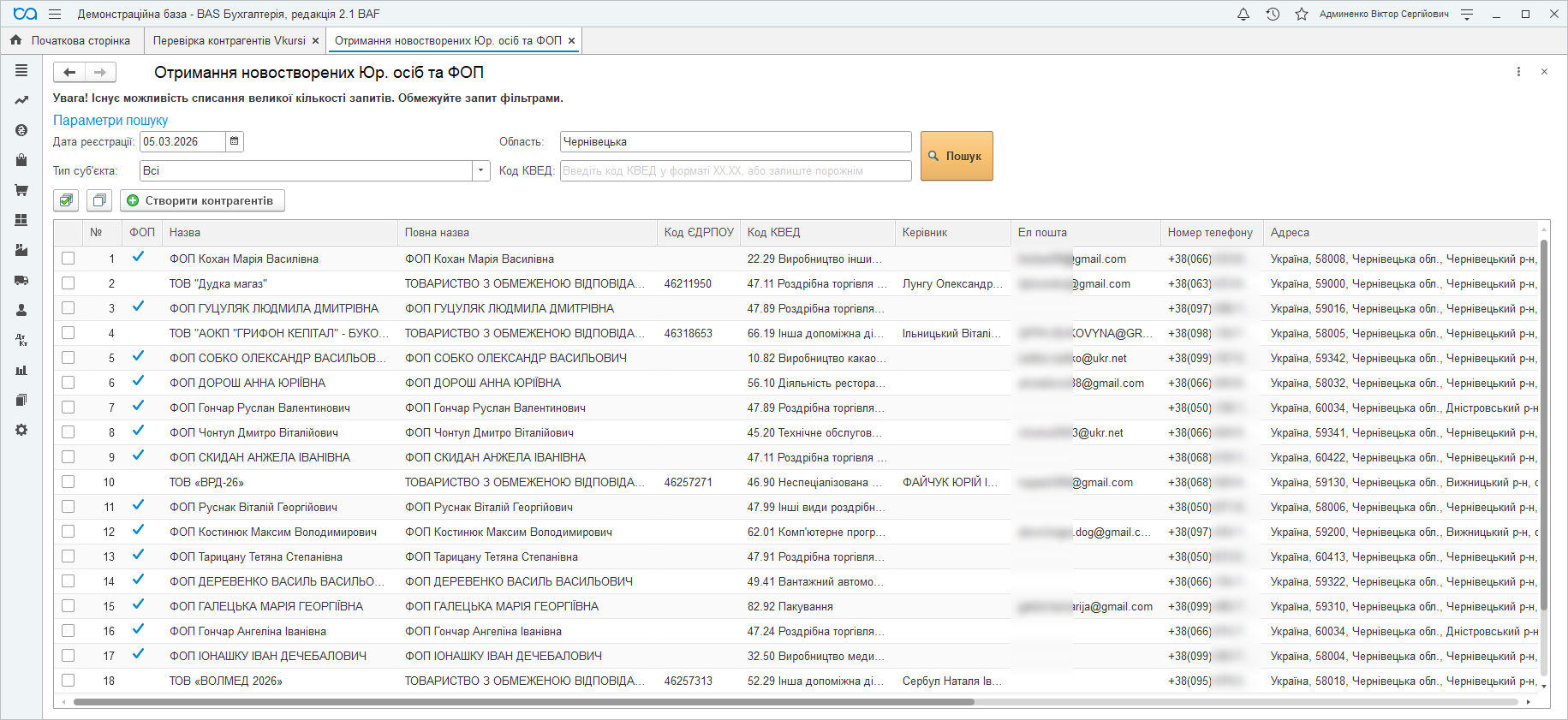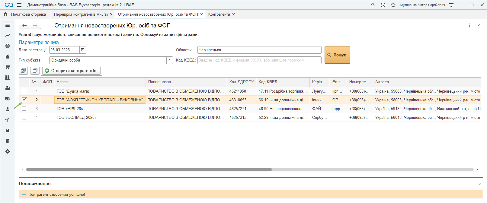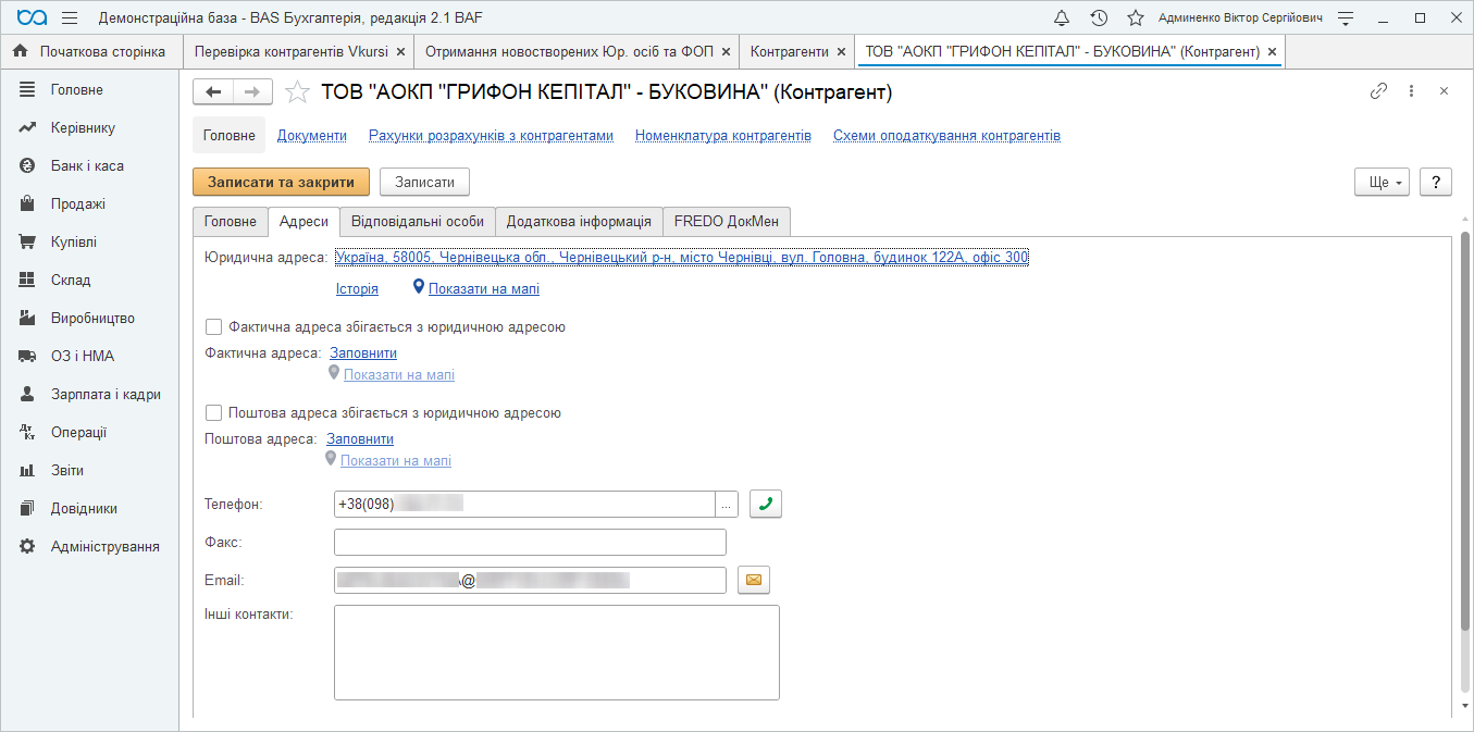 В результате создадутся контрагенты с заполненным кодом ЕГРПОУ, адресом, номером телефона, e-mail, руководителем.