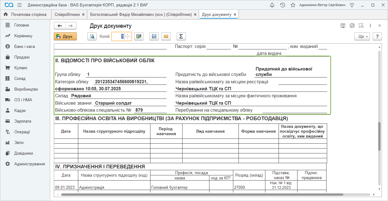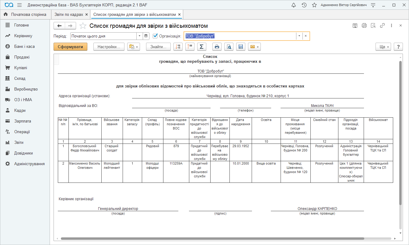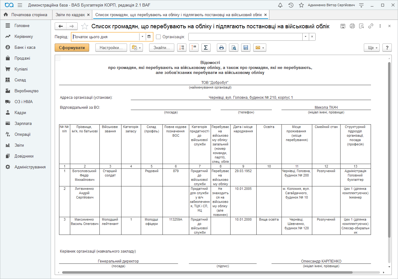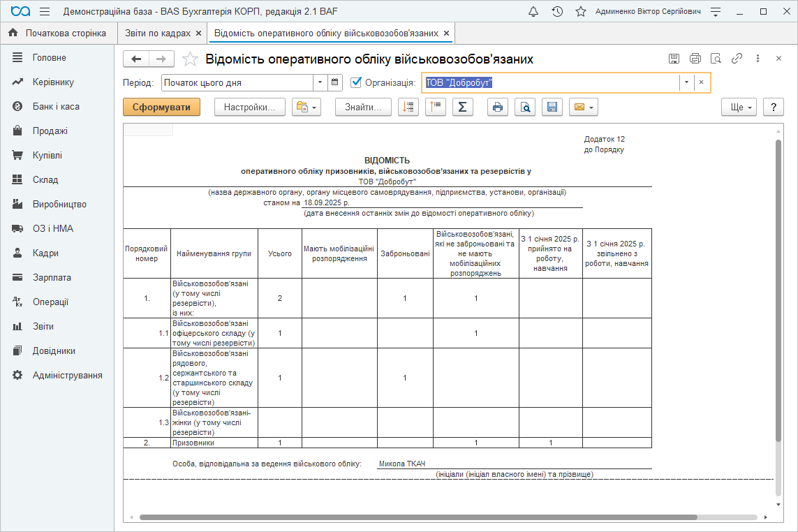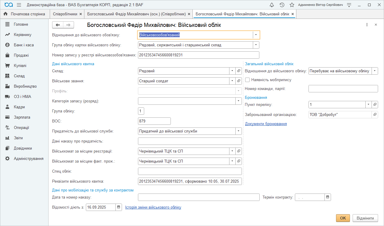 Ведение военного учета и бронирования в «BAS Бухгалтерія КОРП»