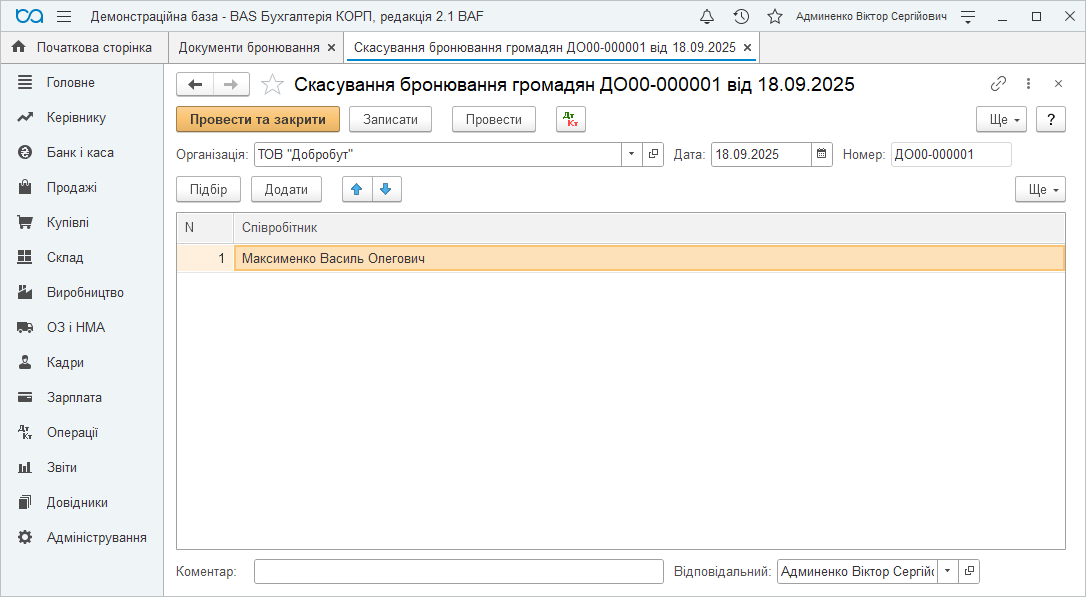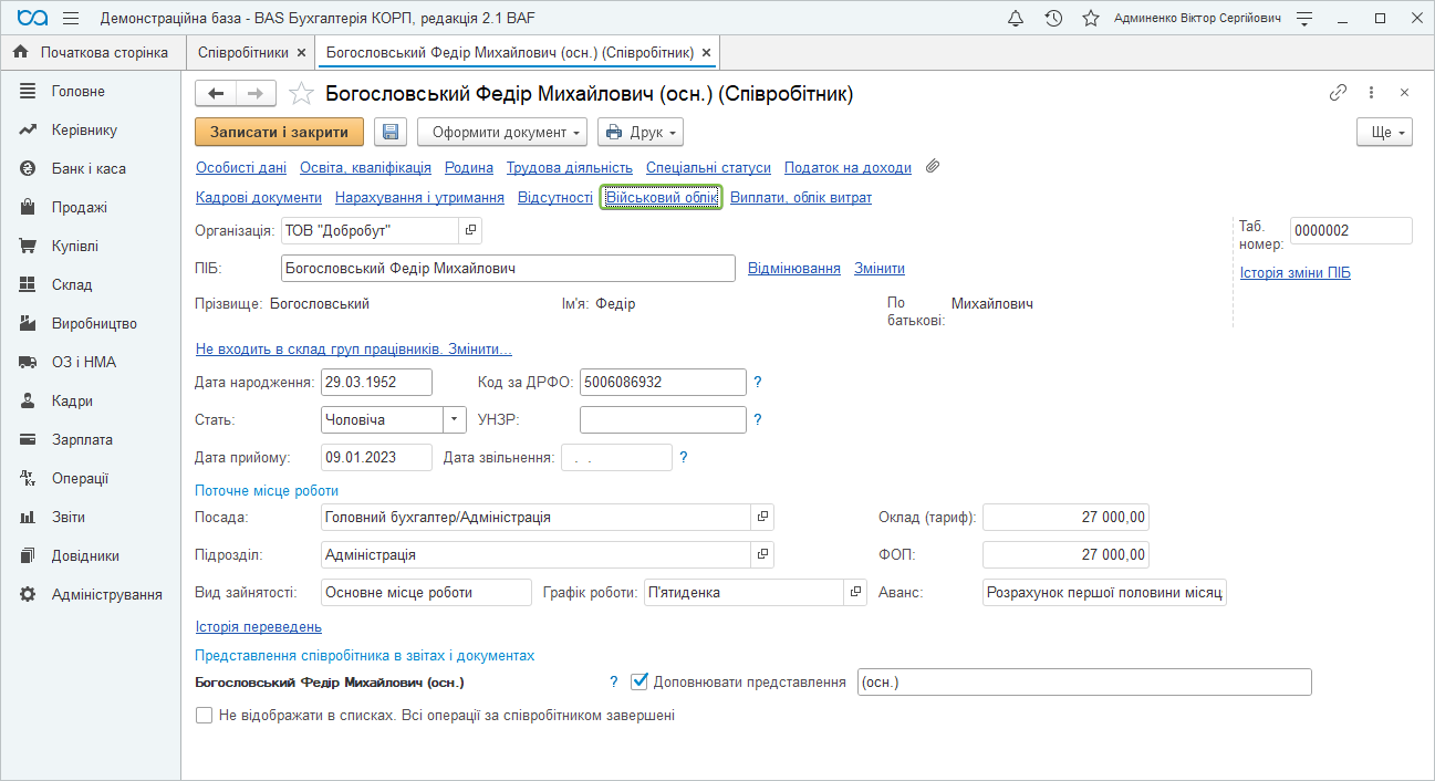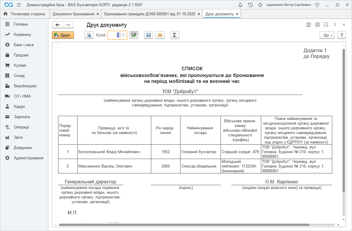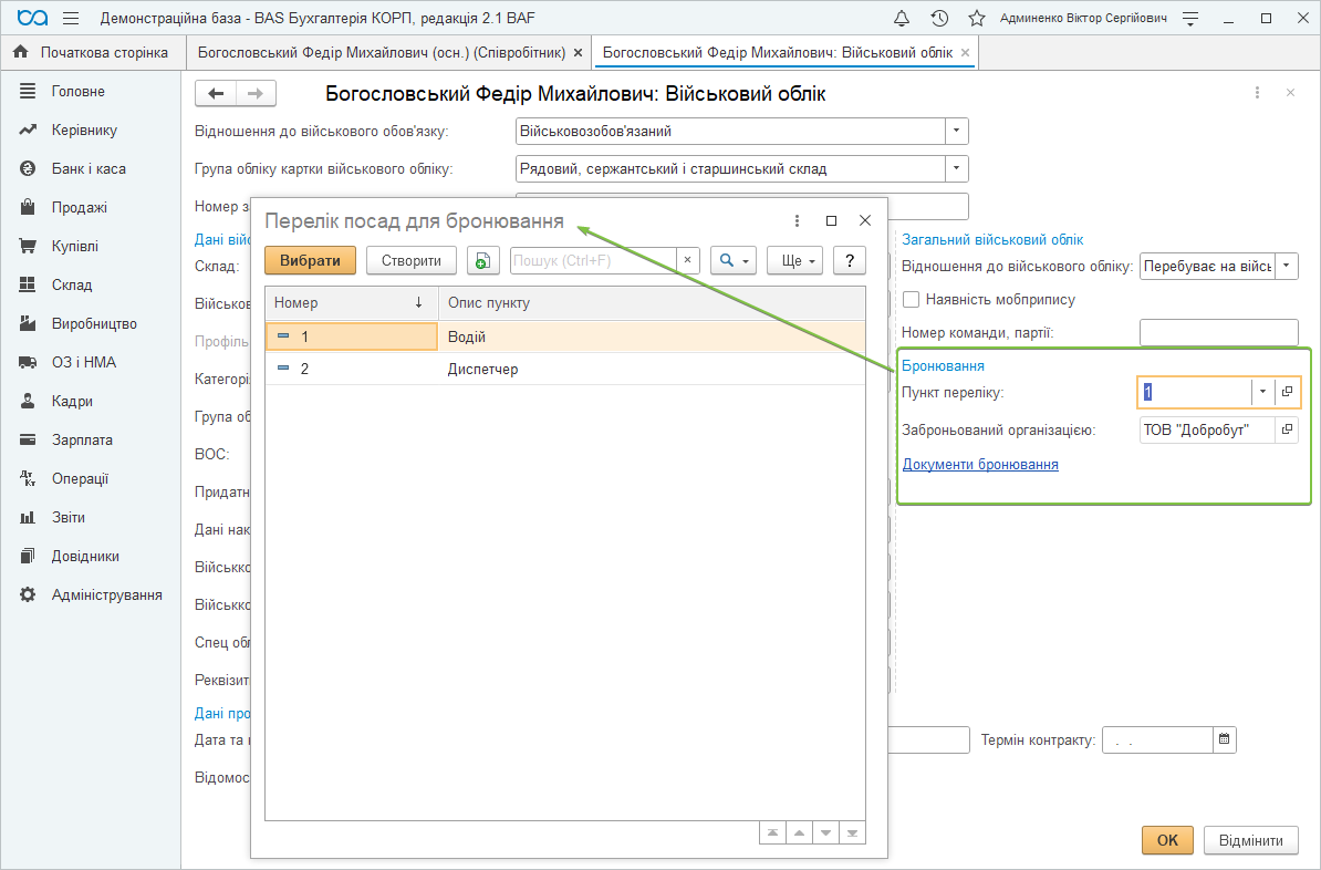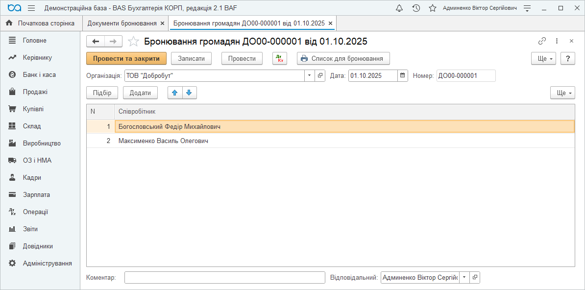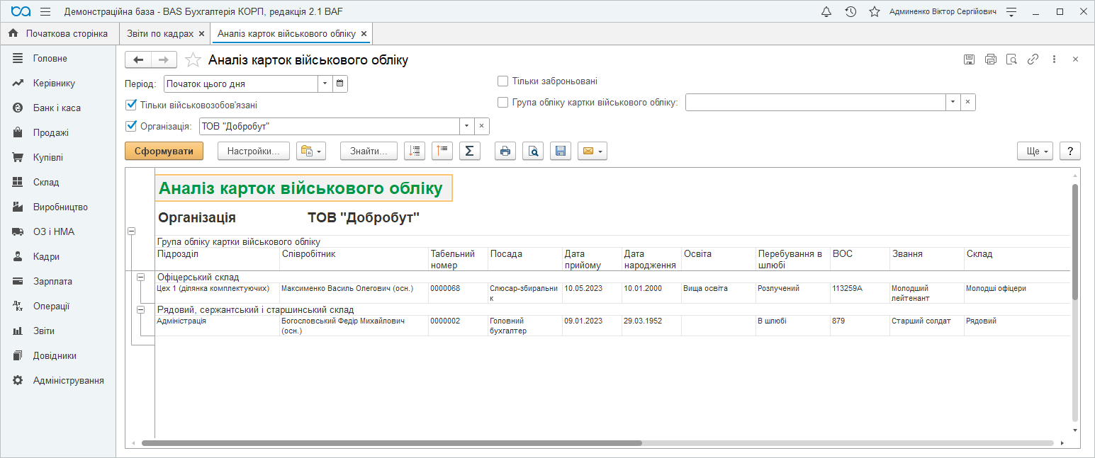 Ведение военного учета и бронирования в «BAS Бухгалтерія КОРП»