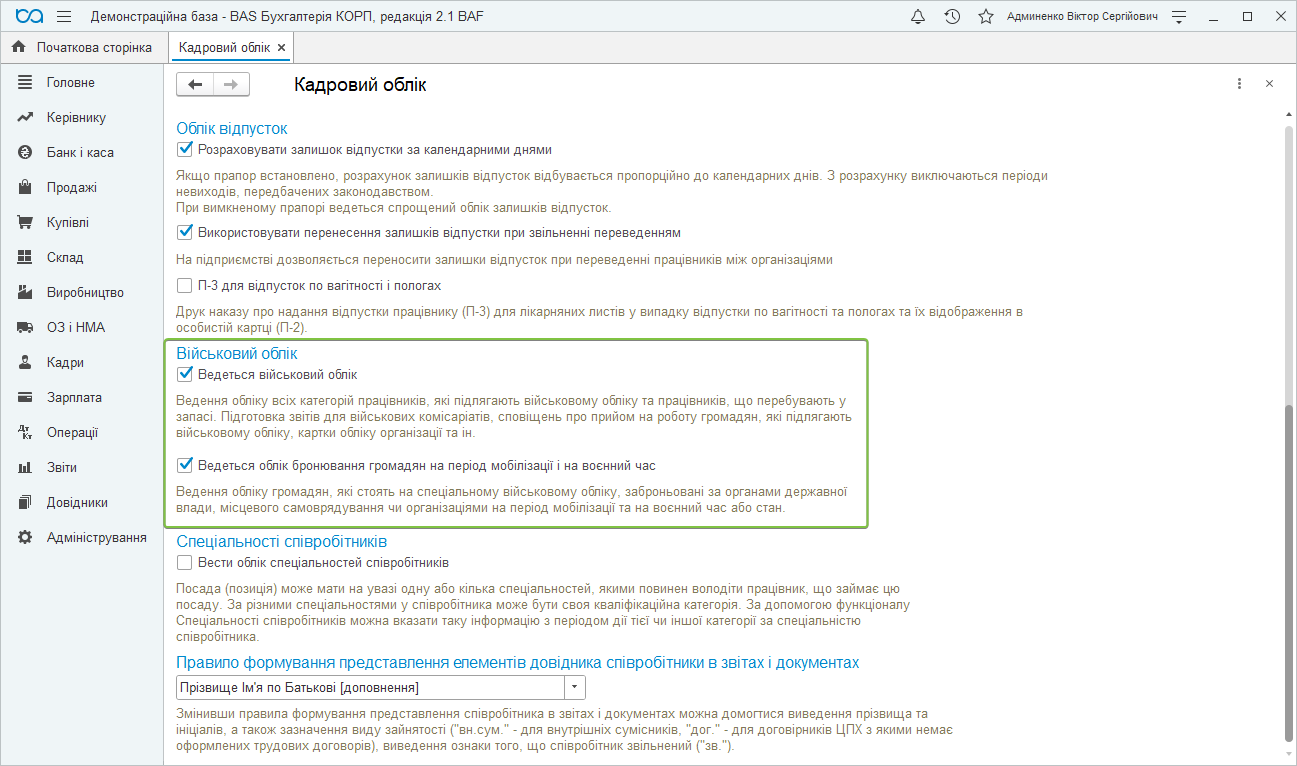 Рассмотрим подробно настройку военного учета в «BAS Бухгалтерія КОРП».
